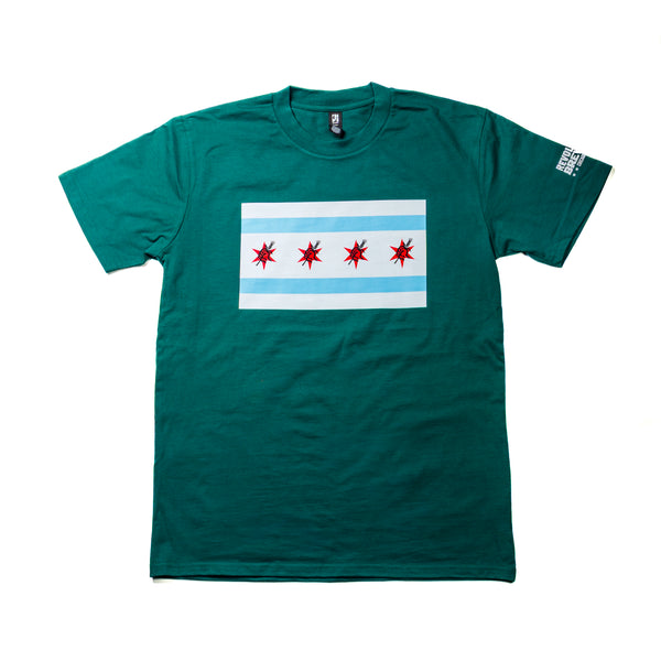 Show your support of both our city and our beer in this St. Paddy's Rev t-shirt featuring the Revolution Chicago Flag on the front and "Revolution Brewing Chicago" on the left sleeve.
